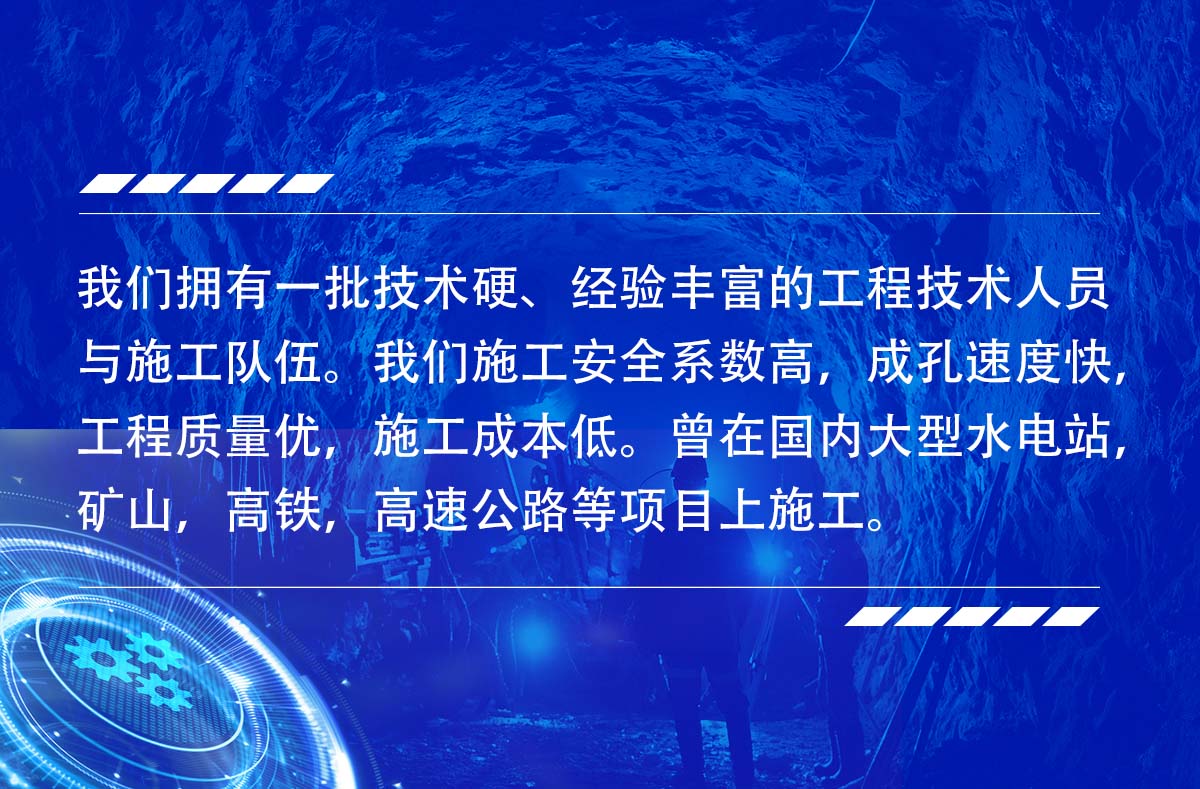 淮北市勤拓礦山工程有限公司是一家從事多年反井鉆機施工的服務生產(chǎn)型公司,公司目前有十幾臺鉆機設備,ZFY120/30/150型反井(天井)鉆機5臺,ZFY1.8/40/250型反井(天井)鉆機4臺,ZFY2.5/70/200型反井(天井)鉆機2臺,ZFY3.0/120/400型反井鉆機1臺,ZFY3.5/120/400型反井(天井)鉆機1臺,可承接深度0-300米,成孔直,0.9~4米.1.2~3米的各種豎井、井下煤倉、溜煤眼、通風井、調壓井、電纜井、泄水井等。我們擁有一批技術硬、經(jīng)驗豐富的工程技術人員與施工隊伍。我們施工安全系數(shù)高,成孔速度快,工程質量優(yōu),施工成本低。曾在國內大型水電站,礦山,高鐵,高速公路等項目上施工。